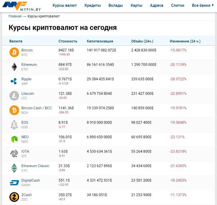 Биткоин по состоянию на 9.30 мск, по данным Coinmarketcap, падает на 15,2% и торгуется по $8,6 тысяч. А согласно данным по курсам криптовалют на сегодня на Myfin.by его цена составляет $8,4 тыс. Как видим, стоимость практически всех валют в первой десятке демонстрирует серьезное снижение.