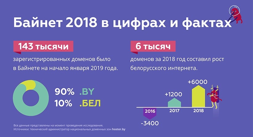 Результаты .BY и .БЕЛ еще чуть выше — плюс 4,2% или почти 6000 имен, сообщили в пресс-службе hoster.by. Это вселяет оптимизм после отрицательной динамики в 2016 и небольшого «выхода в плюс» в 2017 году.