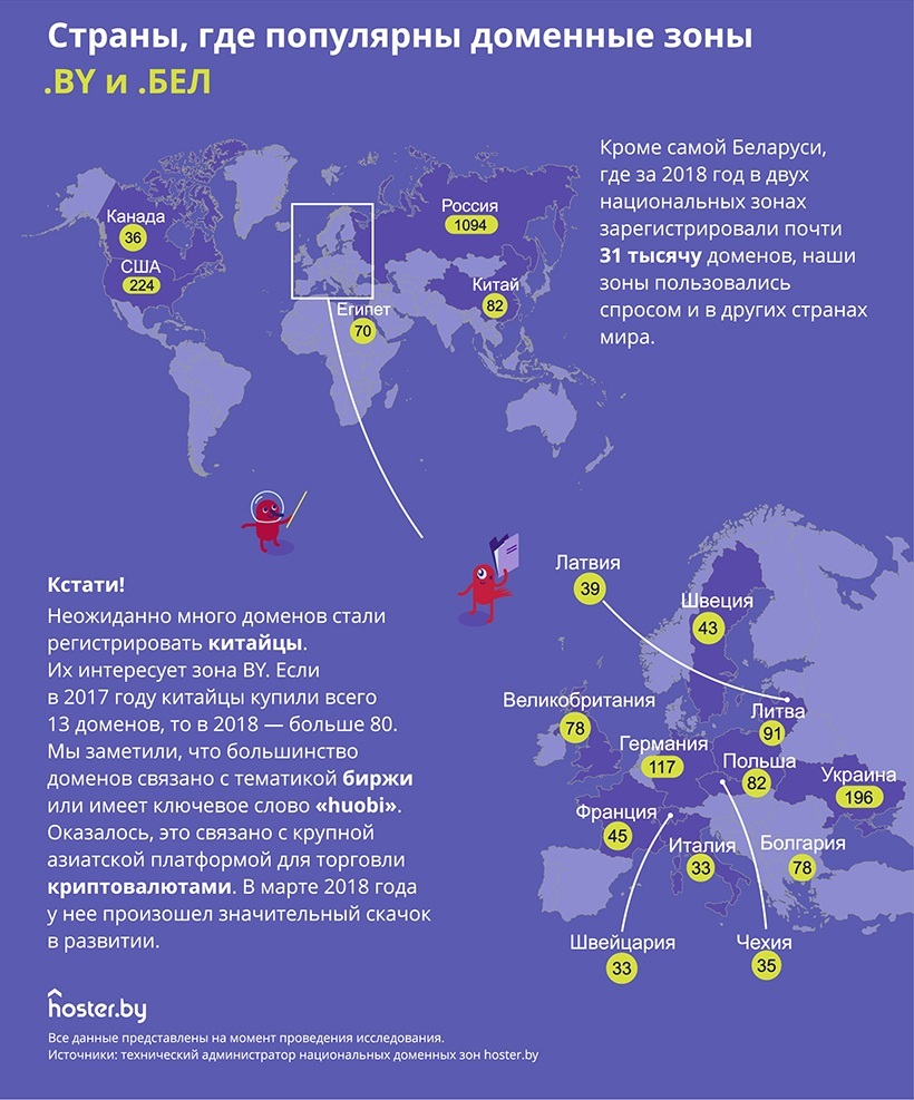 Плюс наметился спрос на домены .BY со стороны Китая. Если год назад представители этой страны регистрировали около десятка белорусских имен, то за 2018 их было зарегистрировано уже 82. И большая их часть связана с крупной азиатской криптобиржей Huobi.