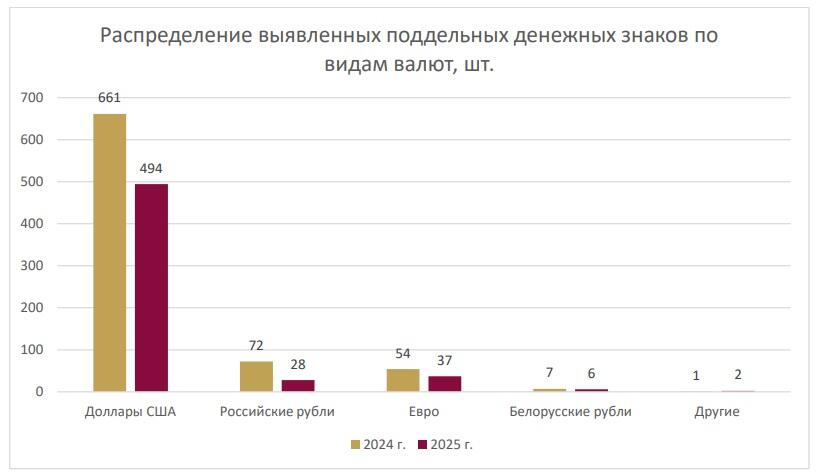 По итогам 2025 года банковскими работниками выявлено 567 поддельных денежных знаков, из которых 561 – банкноты, 6 – монеты.