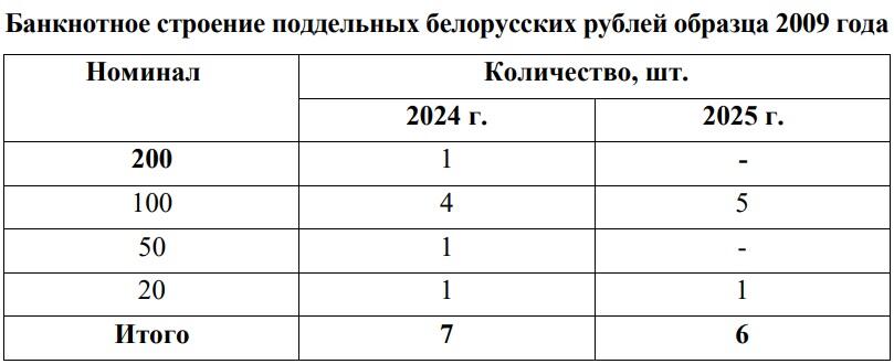 В 2025 году выявлены 6 поддельных банкнот белорусских рублей образца 2009 года – одна номиналом 20 рублей, пять номиналом 100 рублей.