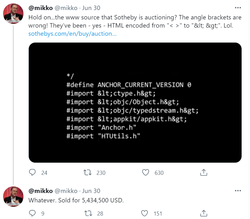 — Погодите... Код WWW, который продают на Sotheby's — а скобки-то неправильные! Из <> в HTML превратились "< >". Лол.