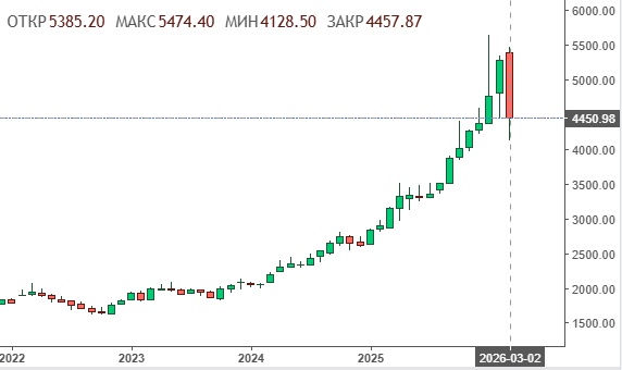 Есть ещё один мировой актив, который в марте претерпел сильнейшие изменения цены – унция золота. Напомним, что в январе 2026 года золото достигало исторического максимума в $5 626,8 за унцию. В феврале цена ожидаемо корректировалась на уровень $5 400 – $5 600 за унцию, но вот март…