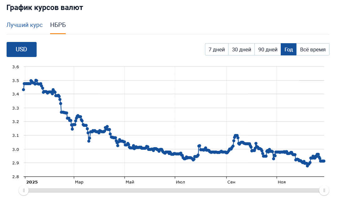 Немногим более года назад, в конце ноября обменный курс доллара США на белорусском валютном рынке достиг исторически максимального значения в USD/BYN 3,5278. Вблизи этого максимума доллар продержался до середины января 2025 года, и тогда казалось – ещё немного и мы зафиксируем доллар по четыре рубля. Но постепенно национальная валюта начала укрепляться и уже к началу декабря этого года курс «бакса» снизился до USD/BYN 2,8767. Итого, к последним торговым дням снижение курса доллара по году превысило 16%. Чем не рекорд года!