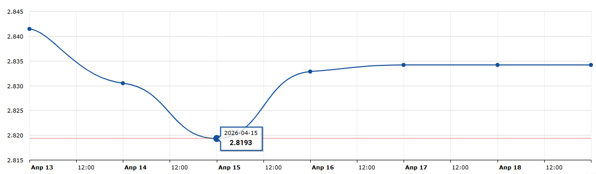 Итоговое укрепление рубля против доллара США составило 0,80%, с начала текущего года -2,365%. Курс закрытия недели валютной пары USD/BYN 2,8341, хотя в середине недели в среду 15 апреля доллар снижался в цене до USD/BYN 2,8193. Это самые низкие котировки доллара США на белорусском рынке с марта 2023 года, то есть за последние три года.