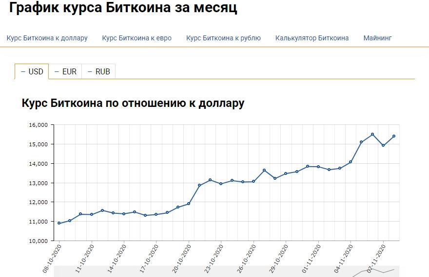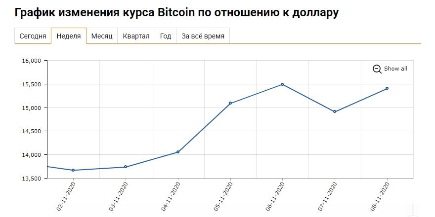 В конце минувшей неделе биткоин преодолел планку в $15 тыс. и превысил максимум с начала 2018 года. Так, 6 ноября, в пятницу, биткоин достиг $15,49 тыс. В начале текущей недели 9 ноября (на 15:03 по Минску) средневзвешенный курс самой популярной криптовалюты составил $15 694.