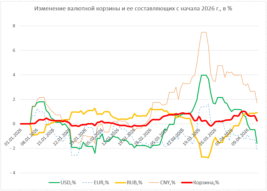 Российский рубль демонстрировал уверенное укрепление к доллару. Основным драйвером оставалась динамика нефти: цена Brent 8 апреля упала на 17,5% до $91 за баррель на фоне новостей о возможных переговорах по урегулированию геополитических конфликтов, однако к концу недели частично отыграла потери, завершив период на уровне около $95,5.