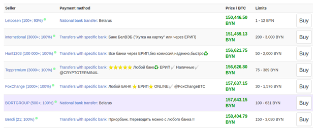 Самый старый и известный сайт в этой категории — LocalBitcoins. Достаточно выбрать из списка стран Беларусь и кликнуть на «Поиск», чтобы отобразить все предложения — их для РБ не так много. Поддерживаются все основные банки, но у каждого продавца — свои условия, комиссии и минимальный размер сделки, поэтому текст объявления нужно читать внимательно.