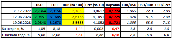 На фоне этих событий евро вырос к доллару за неделю с 1,0760 до 1,0950 (+1,8%). К российскому рублю доллар подрос с 81,5 до 83,8 (+2,8%), он растет третью неделю. К юаню доллар подрос вторую неделю подряд, на этот раз с 7,04 до 7,13 (+1,3%).