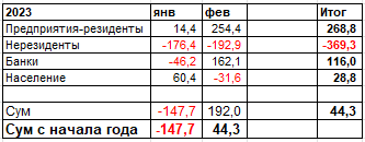 На минувшей неделе НБ РБ опубликовал статистику по покупке-продаже валюты на внутреннем рынке. Можно отметить, что чистыми покупателями валюты в феврале были предприятия-резиденты ($254,4 млн) и банки ($162,1 млн). Чистыми продавцами валюты выступили нерезиденты (-$192,9 млн) и население (-$31,6 млн). Суммарно все четыре категории участников купили на чистой основе в феврале $192,0 млн. Накопительным итогом с начала года роль участников рынка немного другая. Тут предприятия-резиденты, банки и население выступают чистыми покупателями валюты и лишь нерезиденты – чистыми ее продавцами.