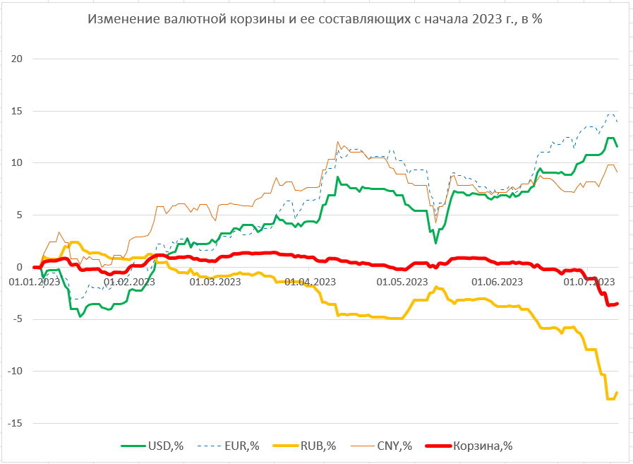 Столь драматичное падение российского рубля перевесило рост доллара и юаня. В результате стоимость валютной корзины снизилась за неделю на 2,42%. Национальная валюта укрепляется к корзине седьмую неделю подряд. При этом в течение недели доллар и евро обновили максимумы с начала года, а российская валюта и корзина в целом – минимумы. Корзина, как и российский рубль, продемонстрировала максимальное недельное падение с июля 2022 года.