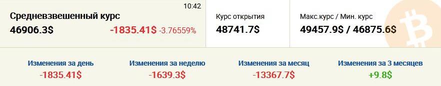 (на 10:40) составил $46906,3. Максимальный курс достигал $49457,9.