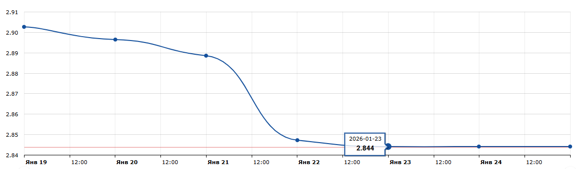 Далее, рубль нашёл поддержку со стороны Минфина РФ и Центробанка, которые увеличили объём продажи иностранной валюты на внутреннем рынке для пополнения государственного бюджета. Объём ежедневных продаж вырос до 17,4 млрд рублей, что почти вдвое выше предложения в декабре. Всё это происходит при низком спросе со стороны импортёров и накануне пика налогового периода 28 января. На следующей неделе это может привести к снижению курса доллара до 72 рублей на российском финансовом рынке. На белорусском валютном рынке это может экстраполироваться в курс доллара около USD/BYN 2,800.