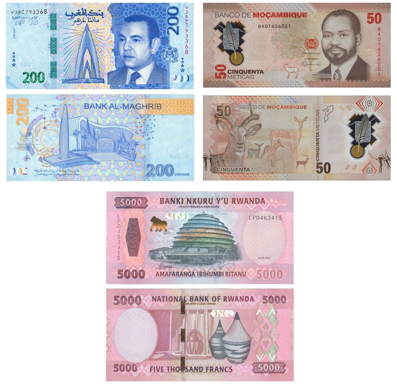 От Африки на звание «Банкнота года – 2024» претендуют Марокко (200 дирхамов), Мозамбик (50 метикалов) и Руанда (5000 руандийских франков).