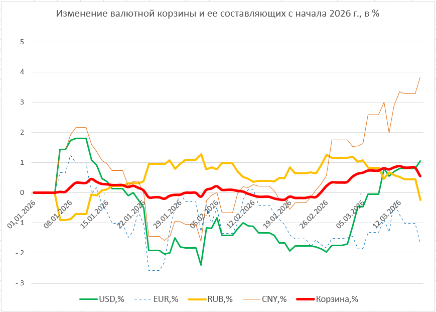 На этот раз снижение курса российского рубля в составе валютной корзины «перевесило» рост доллара и юаня. В результате стоимость корзины после трех недель роста снизилась 0,26%, что означает соответствующее укрепление национальной валюты. Примечательно, что несмотря на снижение корзины по итогам недели, в ее начала стоимость корзины успела отметиться максимумом с начала года.