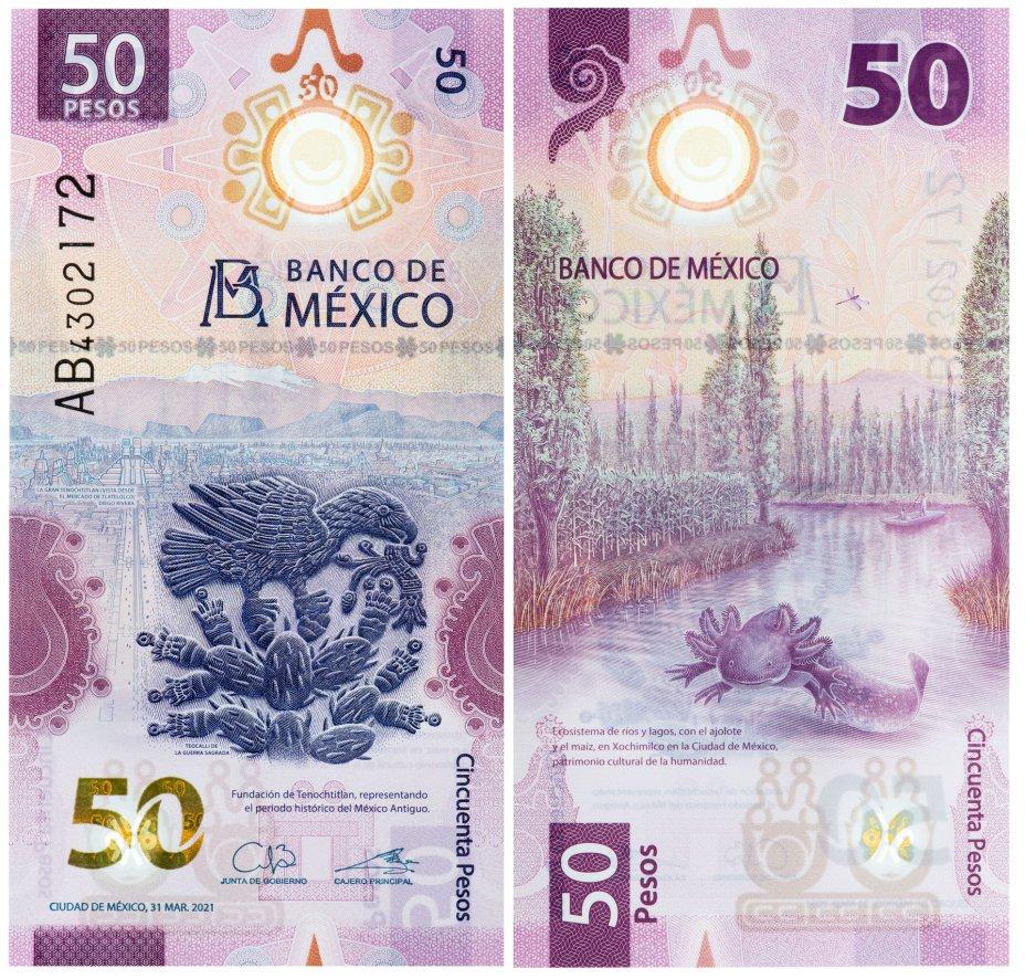 Аверс банкноты номиналом 50 песо посвящен истории Древней Мексики. На переднем плане представлен барельеф с трона ацтекского правителя Монтесумы II, на котором изображен орел, сидящий на кактусе. На заднем плане – город Теночтитлан, находившийся на месте современного Мехико.