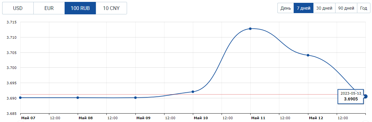 Курс российского рубля за это же время проделал такой же кульбит, только в обратную сторону – на торгах в прошлый четверг, 11 мая, пара RUB/BYN поднималась до 3,7121 за 100 российских рублей, чтобы в субботу зафиксироваться на уровне RUB/BYN 3,6905. Итог недели вышел нулевым.