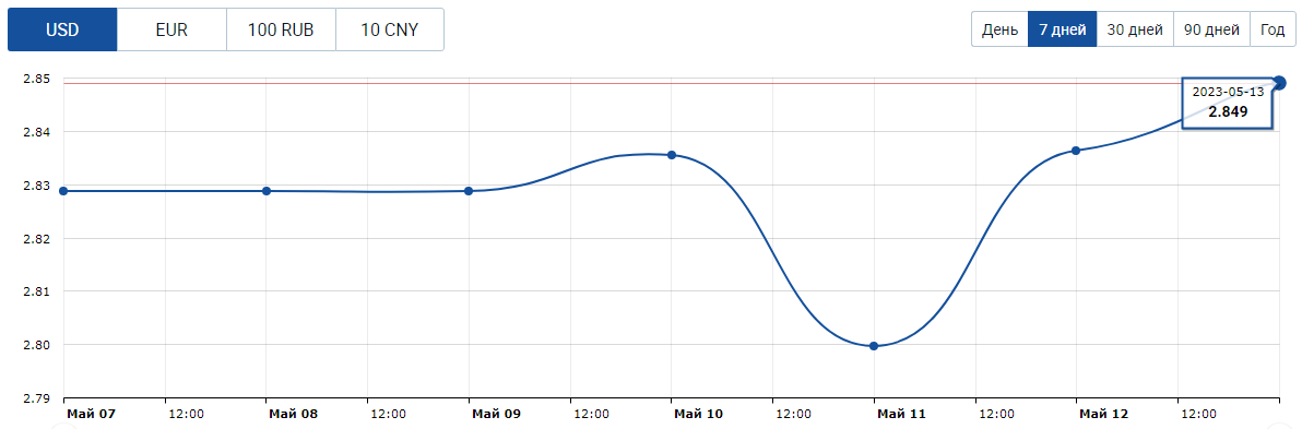 Курс доллара США на белорусском валютном рынке за прошлую неделю снижался до USD/BYN 2,7997 в четверг, 11 мая, но на последних торгах курс вернулся к значению в USD/BYN 2,849. Итого за неделю курс подтянулся на +0,72%. К началу года рост курса также повысился до +4,11%.