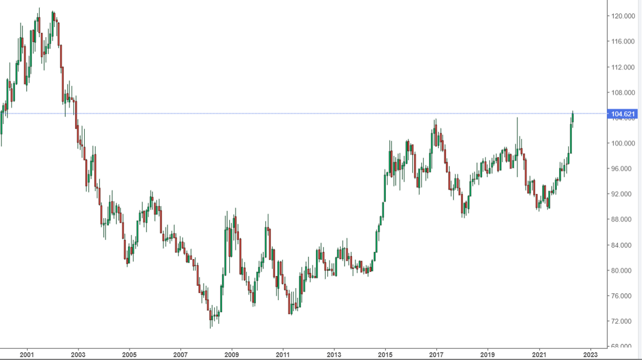 Пара EURUSD опустилась до минимума с 2002 года и в моменте 12 мая падала до EURUSD 1,0351. К слову, любимый многими биткоин в четверг, 12 мая, также опускался до двухлетнего минимума в BTCUSD 26949. Индекс доллара, напротив, поднимается до двадцатилетних максимумов в DXY 104,510 п.п.