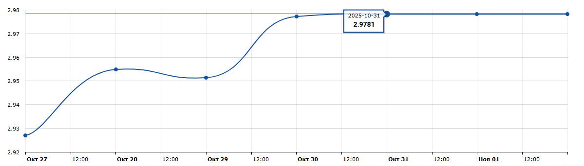 Началась прошлая неделя с падения обменного курса доллара на -1,78% до USD/BYN 2,9270. И к окончанию торговой недели доллар почти восстановился, но по итогу недели остался в лёгком минусе на -0,07%. К началу 2025 года сохраняется снижение обменного курса доллара на -14,26%. Курс закрытия торгов в пятницу 31 октября составил USD/BYN 2,9781. При этом объём торгов за неделю сложился третьим по величине в этом году с 93,082 млн долларов, а всего за октябрь доллар торговался на второй объём в году с 354,569 млн долларов США.