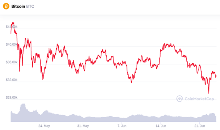 Эффект этих новостей хорошо виден на графике: с 21 мая по 22 июня цена упала с $41 000 до локального минимума в $29 000.