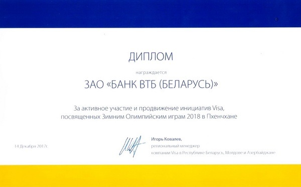 Компания Visa International отметила банк ВТБ (Беларусь) дипломом за активное участие и продвижение инициатив Visa, посвященных Зимним олимпийским играм 2018 в южнокорейском Пхенчхане. Награждение состоялась в рамках ежегодной премии Visa «Итоги Года 2017».