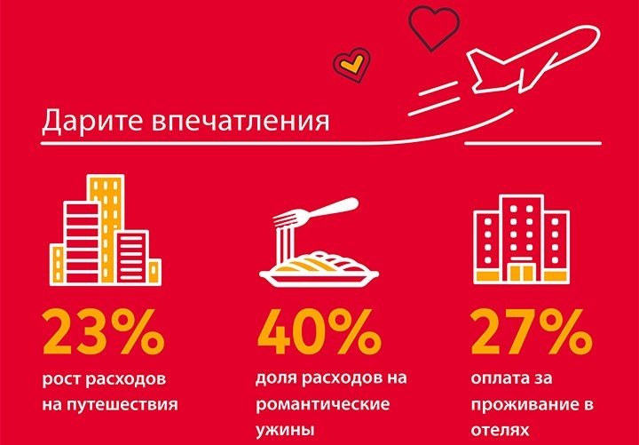 Возможность ненадолго сбежать с возлюбленным в романтическую поездку (на поезде или самолете) выбирают все чаще: количество банковских операций по оплате путешествий в 2017 году выросло на 23% и составило 22% от всех трат в эти февральские дни. Отдых в отеле остается фаворитом – 27% всех расходов.