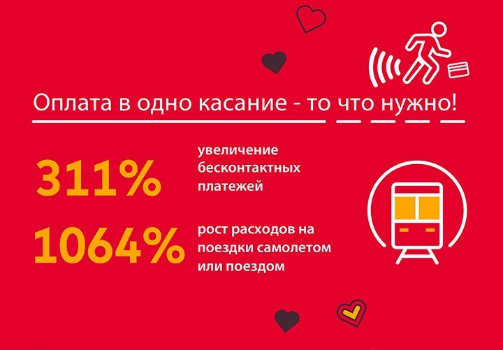 Все популярнее становится бесконтактная технология оплаты. Общая сумма бесконтактных транзакций увеличилась на внушительные 311%, а количество таких платежей в Дни святого Валентина с 2015 года – на 203%. Более того, расходы, оплаченные в одно касание, выросли по всем категориям, включая самые популярные: путешествия на самолетах и поездах (1064%), ювелирные изделия (453%) и цветы (446%).