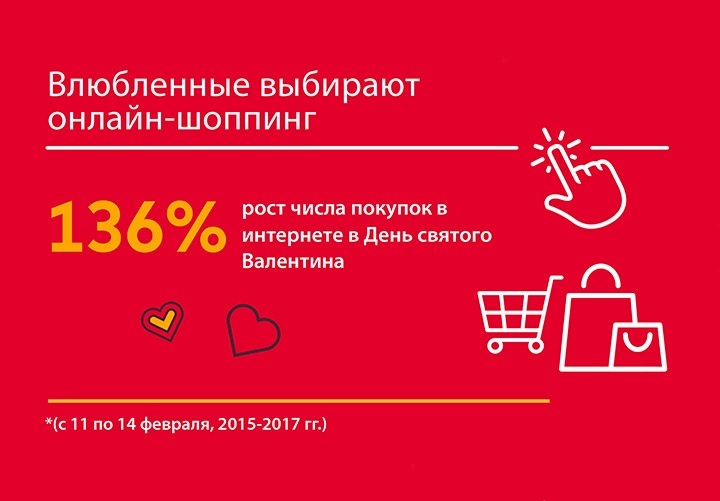 Онлайн-шоппинг также продолжает развиваться: количество электронных платежей в День святого Валентина с 2015 по 2017 год выросло на 136%.