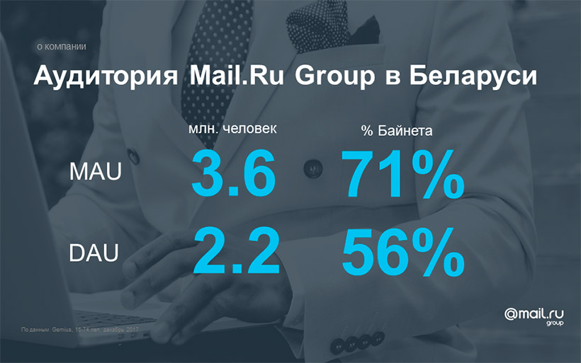 О трендах российского рынка интернет-рекламы, аудитории ресурсов Mail.Ru Group в Беларуси и новых интересных форматах рассказала Екатерина Ерошенко, руководитель группы международных и региональных продаж Mail.Ru Group. 71% белорусской интернет-аудитории хотя бы один раз в месяц посещает ресурсы Mail.Ru Group, которые, в свою очередь, предлагают широкий инструментарий для эффективного взаимодействия с этой аудиторией: социальные сети, кроссплатформенное размещение, нативные и нестандартные форматы. Так участники познакомились с примерами креативного подхода к использованию мобильного параллакса в почте и мобильного канваса, а также брендирования главной страницы Mail.Ru.