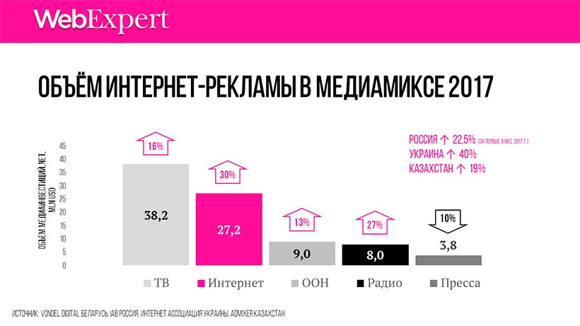 В 2017 году белорусский рекламный рынок достиг объёма 86,2 млн. долл. и показал рост в 19%. В структуре медиаинвестиций наиболее интенсивно развивался сегмент интернет-рекламы, который вырос на 30% и составил 27,2 млн. долл., что в свою очередь представляет 31,5% от всего объёма медиаинвестиций Беларуси и в будущем его доля также продолжит расти. Это повторяет тенденцию мирового медийного рынка, на котором инвестиции в digital уже опередили ТВ.