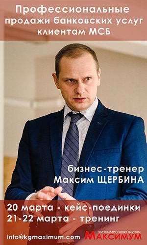 Бизнес-тренер – Максим Щербина, руководитель Консалтинговой группы «Максимум», банковский опыт 15 лет, более 20 постоянных клиентов в банковской и финансовой сфере, организатор Международной банковской конференции «Маркетинг и продажи финансовых услуг», руководитель Бизнес-клуба «Интеллект-Капитал».