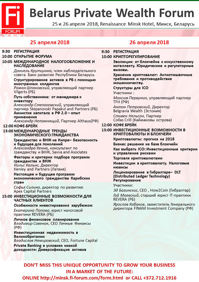 Спикеры форума: Даниель Крутцинна, Civitta, Софья Силина, директор по развитию, APEX Capital Partners, Кирилл Николаев, CEO, BITCOIN VIP, Роман Осипов, CEO, UNITER, Александра Кенна, Savva and Associates, Александр Степановский, SPP и партнеры, Нильс Кан, Henley & Partners, Максим Первунин, TFH, Екатерина Попова, REVERA, Гай Маевский, REVERA и многие другие