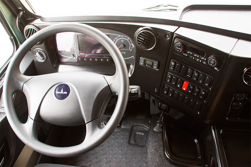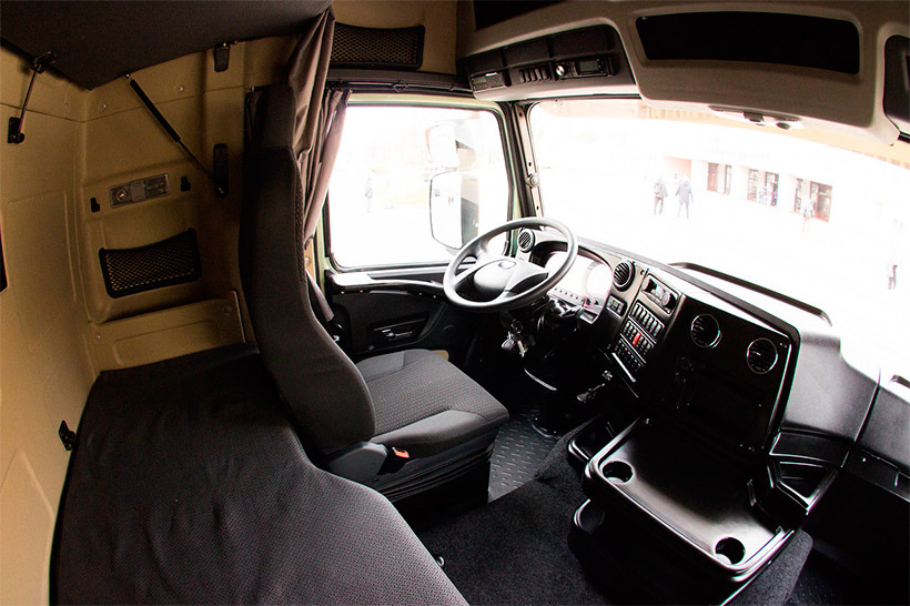 Грузовик получил полностью обновленный интерьер. По сравнению с прототипом, кабина отличается повышенной шумоизоляцией и оснащена новой панелью приборов, полками и двумя багажными отсеками по 200 литров каждый. Внутри установили холодильник и два увеличенных спальных места. В базовый комплект входят мультиплексная система управления с электронным щитком приборов и встроенным бортовым компьютером, климат-контроль, круиз-контроль и мультимедийная система. За акустику отвечают четыре динамика – по два с каждой стороны. Места для водителя и пассажира стали просторнее, а управлять автомобилем предлагается в сиденьях европейской компании ISRI.