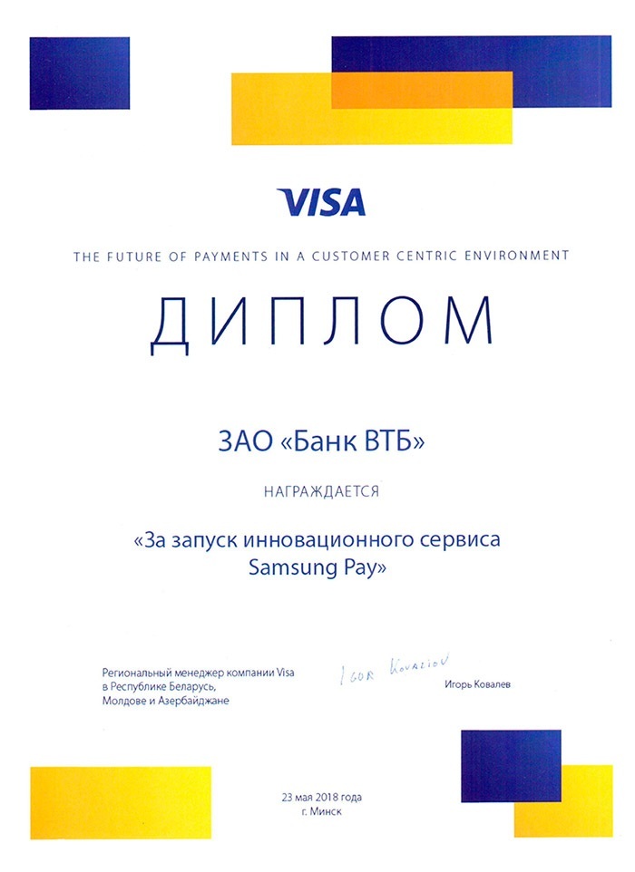 Банк ВТБ (Беларусь) награжден почетным дипломом компании Visa International «За запуск инновационного сервиса Samsung Pay». В начале 2018 года банк ВТБ первым в Беларуси совместно с Samsung и Visa предоставил пользователям платёжный сервис Samsung Pay, с помощью которого держатели карт Visa могут использовать свои устройства Samsung для оплаты покупок на любом платёжном терминале, как в Беларуси, так и за рубежом.