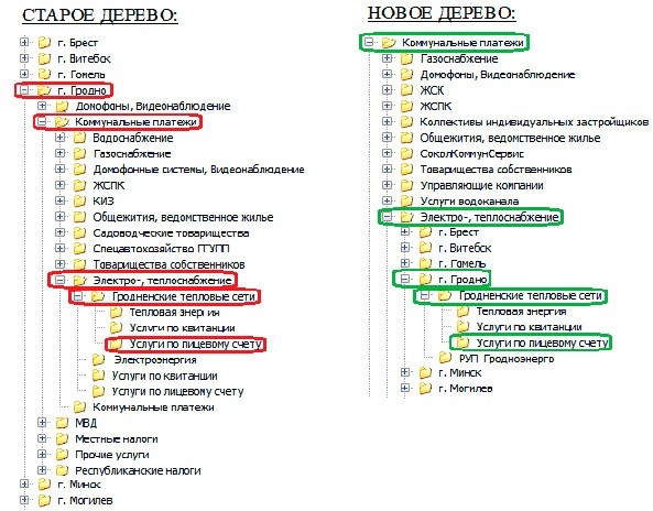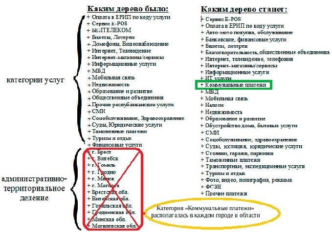 В прежнем дереве услуг ЕРИП были предусмотрены категории услуг (например, мобильная связь, образование и развитие, финансовые услуги и т.д.), и административно-территориальное деление (областные города и г.Минск, области Республики Беларусь). После модернизации дерева услуг ЕРИП вместо двух частей, категорий услуг и региональной части, будет одна часть, состоящая только из категорий услуг. Выбрав конкретную категорию услуг (коммунальные платежи, мобильная связь, интернет-магазин), пользователь сможет выбрать нужный регион и совершить оплату.