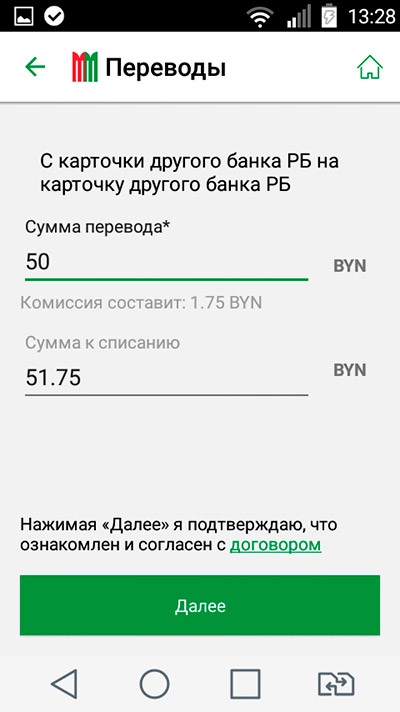 В соответствующем разделе приложение позволяет осуществлять разные виды денежных переводов, как между карточками Банка Москва-Минск, так и между картами разных банков.