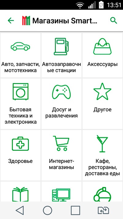 В разделе «Магазины Smart Карты» представлены партнеры этого банковского продукта в разбивке по темам. Наглядно и удобно.