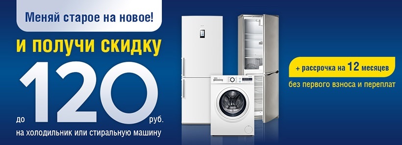 Размер скидки зависит от товара, приобретаемого покупателем. Скидка предоставляется не на весь ассортимент – товары, участвующие в акции, указаны на сайте. Утилизация старой бытовой техники осуществляется бесплатно.