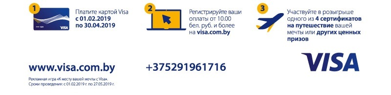 - В период с 1 февраля 2019 по 30 апреля 2019 включительно совершить безналичную операцию с использованием карточки Visa по оплате товаров/работ/услуг, в том числе онлайн платежи, на сумму эквивалентную 10 (десяти) белорусским рублям и более.