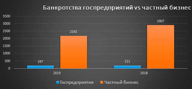 Что касается банкротств государственных организаций, организаций, имеющих долю государственной собственности в уставном фонде, градообразующих и приравненных к ним организаций, бюджетообразующих, системообразующих организаций, то их число в статистических данных снизилось на 1 января 2019 на 7 % (197 предприятий).