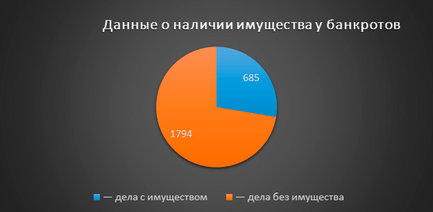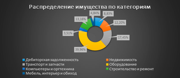 И самая важная статистика с точки зрения бизнесмена, выступающего, как правило, кредитором в таких делах, есть ли имущество у должников в банкротстве при реализации которого возможен возврат долгов. Цифры, безусловно, не радуют, потому как почти треть компаний в банкротстве имеют хоть какое-то имущество. Причем в большинстве случаев такое имущество будет представлено оборудованием, транспортом и недвижимостью.