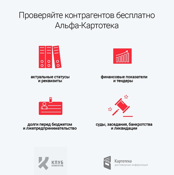 Большинство этих ситуаций можно предотвратить, если заранее проверить контрагента. Сделать это бесплатно предлагает Альфа-Банк с помощью партнерского проекта «Альфа-Картотека».