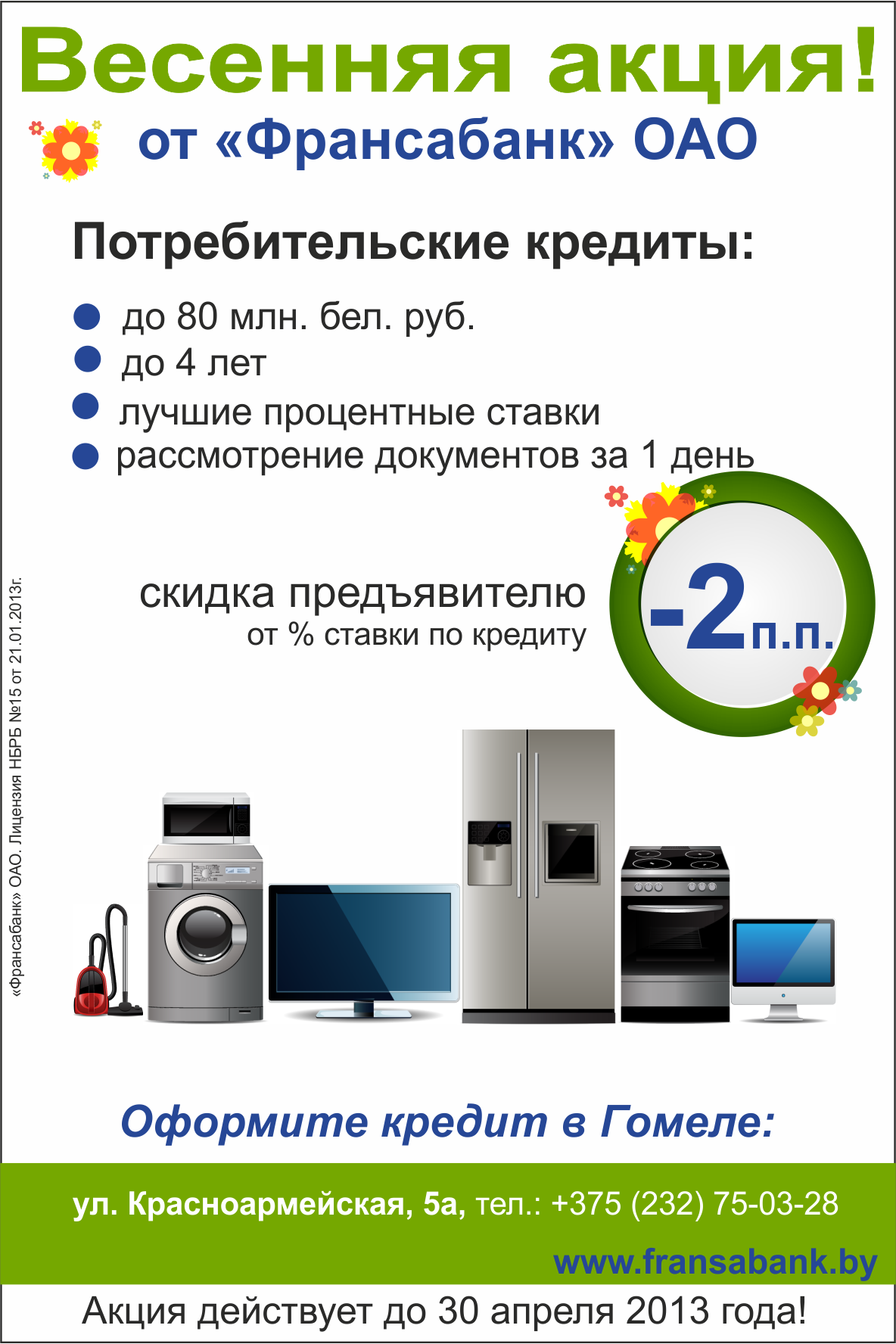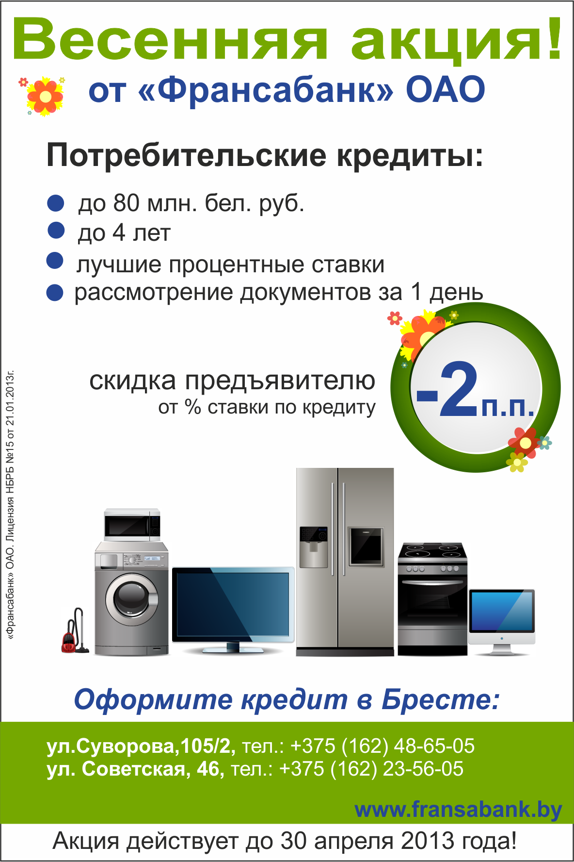 - Экспресс — кредит «За один визит» (процентная ставка с учетом скидки составит «ставка рефинансирования НБ РБ, увеличенная на 23 процентных пункта»);