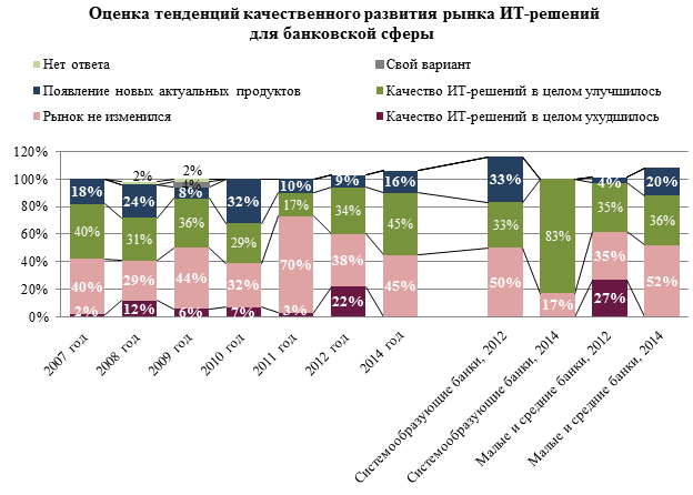 В мае-сентябре 2014 года Ассоциацией «Инфопарк» в рамках подготовки к 11-му Международному форуму по банковским информационным технологиям «БанкИТ’2014» было проведено исследование «Обзор рынка информационных технологий в банковской сфере в 2014 г.»*. Результатом исследования стал отчет, в котором содержатся данные по технологиям, внедренным в банках, их оценке, а также планируемым к внедрению решениям. Эксперты из банковской сферы, ИТ-компаний высказали свое мнения относительно наблюдаемых тенденций.