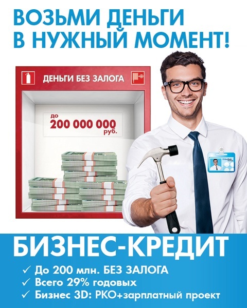 Специально для представителей малого бизнеса мы разработали комплексное предложение – пакет услуг «Бизнес 3D». Воспользуйтесь этим предложением и получите до 200 миллионов рублей по ставке всего 29% годовых! Мы не ограничиваем Вас в выборе и предоставляем кредиты на любые цели. При этом деньги Вы получите всего через 2-3 дня после подачи заявки.