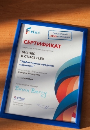 Команду BrainBerry (Бадеева Д., Полторан В., Варава А., Насалевич А.) МТБанк наградил специальным призом – сертификатом на посещение мероприятия «Бизнес в стиле FLEX», где студенты Белорусского государственного экономического университета смогут познакомиться с секретами эффективных продаж и маркетинга от бизнес-тренера, соучредителя и партнера компании BusinessTools Дмитрия Исмагулова.