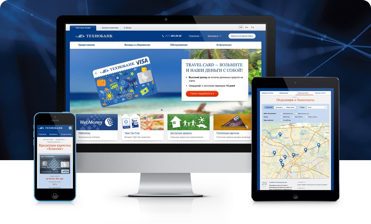 «При разработке концепции сайта Технобанка мы отошли от привычной для белорусских банков информационной подачи услуг и попробовали взглянуть на выбор продуктов глазами клиентов банка,– подчеркнул Иван Панасюк, коммерческий директор компании «Новый сайт», разрабатывающей сайт банка. – Уже с главной страницы на первый план выдвинуты подборы и фильтры, помогающие клиенту разобраться во всем многообразии продуктов и сделать свой выбор. Это было непросто: Технобанк, являясь универсальным банком, предлагает не только широкий список востребованных продуктов для физических лиц и для бизнеса, но и уникальные для Беларуси услуги, такие как Tax Free и Webmoney».