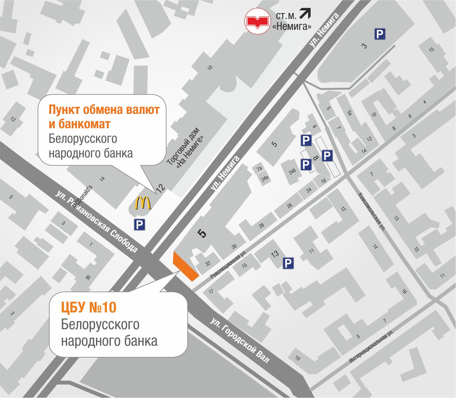 Помещение ЦБУ №10 расположено в Центральном районе столицы на первом этаже нового многофункционального комплекса, размещенного на оживленном перекрестке: на пересечении улиц Немига, Романовская слобода и Городской вал. Здание является одним из центров притяжения жителей и гостей Минска. Войти в банк можно как с улицы, так и через холл торгового центра «Метрополь». Удобное расположение, яркий привлекательный дизайн и высокие стандарты качества обслуживания гарантируют новому офису БНБ-Банка быстрое наполнение благодарными клиентами.