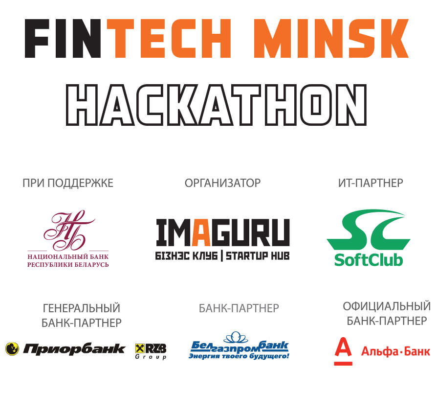 FinTech Minsk Hackathon пройдет 18-20 сентября в бизнес-клубе Имагуру при поддержке Национального Банка Беларуси, IT-партнера компании «СофтКлуб», генерального банка-партнера Приорбанк, официального банка-партнера Альфа-Банк и банка-партнера Белгазпромбанк.
